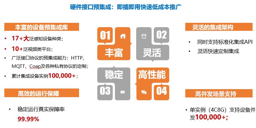 迄今尊龙官方已经预集成17+大泛感知设备种类,10+泛视频类平台,广泛接口协议的预集成能力涵盖了HTTP、MQTT、Coap及各种私有协议的定制,累计集成设备实例达100,000+。它还支持标准化集成API,可灵活快速地定制集成,通过构建规则引擎,实现了各设备间的联动应用,比如检测到违规停车,联动广播就会自动播报提醒,为社区管理服务赋能。